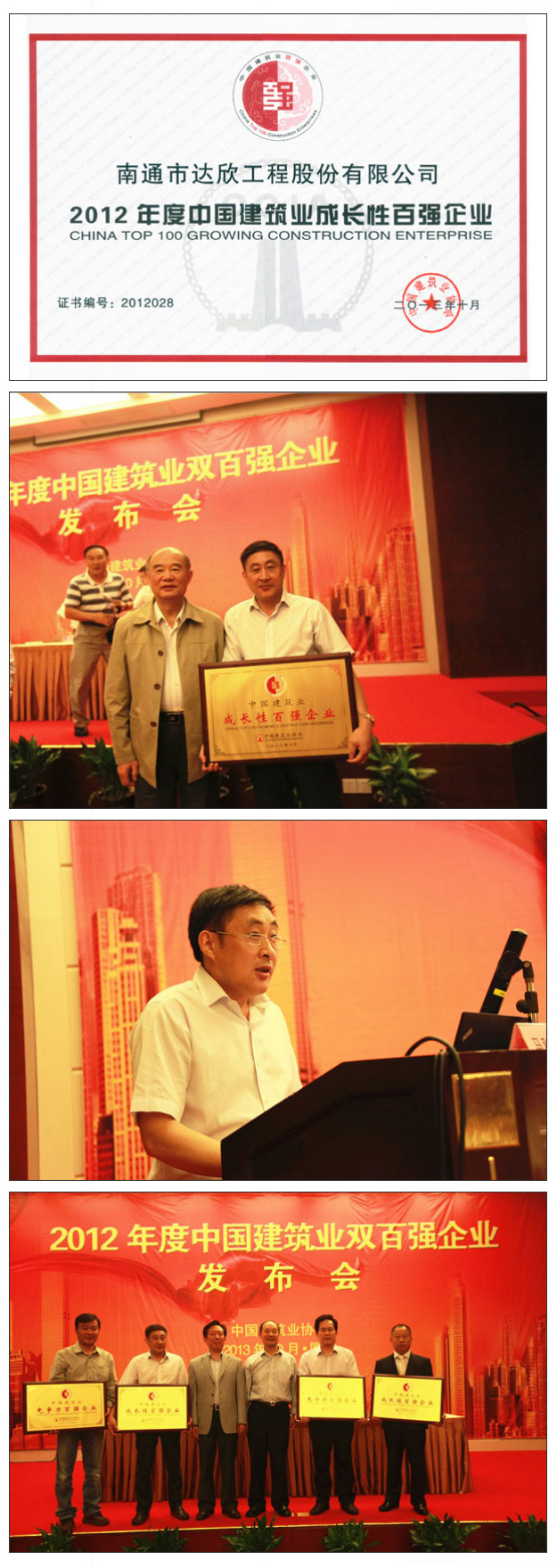 會議發(fā)布了2012年度中國建筑業(yè)雙百強(qiáng)企業(yè),南通市達(dá)欣工程股份有限公司再次入選成長性百強(qiáng)企業(yè)(綜合排名位列第28名,比去年排名提高了21位);會議向2012年度中國建筑業(yè)雙百強(qiáng)企業(yè)頒發(fā)牌證,我公司作為獲獎企業(yè)代表上臺領(lǐng)取獎牌;會議還同時(shí)進(jìn)行了中國建筑業(yè)雙百強(qiáng)企業(yè)代表經(jīng)驗(yàn)交流,公司董事長馬和軍作為江蘇地區(qū)代表、作為成長性百強(qiáng)企業(yè)代表在會上作了“砥礪奮進(jìn),拼搏進(jìn)取,實(shí)現(xiàn)企業(yè)新跨越”的經(jīng)驗(yàn)交流。
