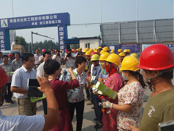 7月6日,第三、第十工程公司承建的邯鄲商貿(mào)城項(xiàng)目,迎來(lái)了邯鄲市委、市政府、市總工會(huì)組成的慰問團(tuán)。慰問團(tuán)一行向奮戰(zhàn)在施工一線的廣大干部職工發(fā)放了夏季慰問品??偣?huì)主席在現(xiàn)場(chǎng)發(fā)表了熱情洋溢的講話,高度贊譽(yù)達(dá)欣是一支過(guò)硬善戰(zhàn)的施工隊(duì)伍,并勉勵(lì)全體參戰(zhàn)人員鼓足干勁,保證工程按期封頂,按期交工。
