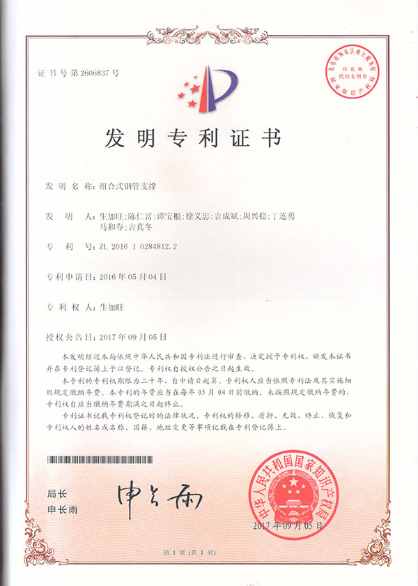 “組合式鋼管支撐”獲得國(guó)家發(fā)明專利
