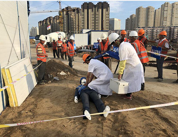 此次應(yīng)急救援預(yù)案演練模擬施工工人從高處墜落?!耙馔狻卑l(fā)生后,現(xiàn)場負(fù)責(zé)人立即組織人員撤出危險區(qū),并在匯報情況后聽從指示在第一時間啟動應(yīng)急預(yù)案。在應(yīng)急總指揮的指令下,救援小組迅速就位,并有序展開警戒護(hù)衛(wèi)、技術(shù)排險、現(xiàn)場搶險、醫(yī)療救護(hù)等各項(xiàng)救援工作,使險情得到有效控制,隨后,傷員被送往醫(yī)院進(jìn)行救治。