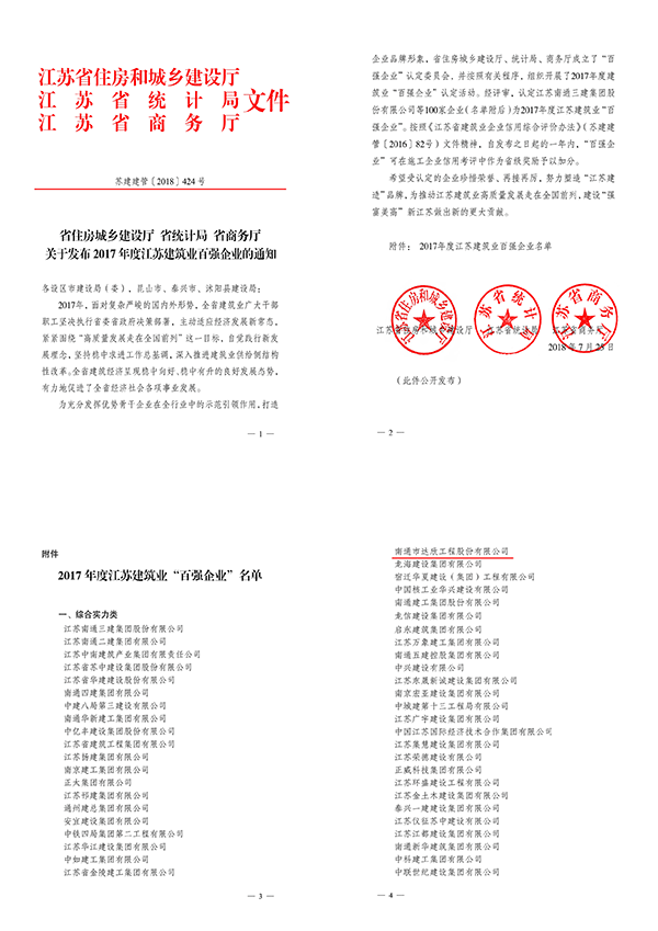 江蘇建筑業(yè)“百強(qiáng)企業(yè)”是由省建設(shè)廳、省統(tǒng)計(jì)局、省商務(wù)廳成立的“百強(qiáng)企業(yè)”認(rèn)定委員會(huì)評議認(rèn)定,從企業(yè)營業(yè)額等經(jīng)濟(jì)類指標(biāo)、質(zhì)量安全、技術(shù)創(chuàng)新指標(biāo)等方面進(jìn)行綜合評定,旨在充分發(fā)揮優(yōu)勢企業(yè)在全行業(yè)中的引領(lǐng)和示范作用,打造建筑企業(yè)品牌,提升核心競爭力,是權(quán)威性的政府評選。同時(shí)按照《江蘇省建筑業(yè)企業(yè)信用綜合評價(jià)辦法》(蘇建建管〔2016〕82號(hào))文件精神,自發(fā)布之日起的一年內(nèi),“百強(qiáng)企業(yè)”可在施工企業(yè)信用考評中作為省級(jí)獎(jiǎng)勵(lì)予以加分。