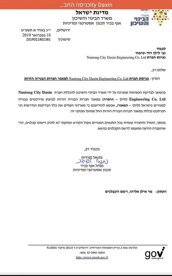 近年來(lái),達(dá)欣集團(tuán)積極響應(yīng)國(guó)家“走出去”和“一帶一路”戰(zhàn)略,大力發(fā)展國(guó)際工程承包業(yè)務(wù),此次中標(biāo)以色列承包商資格,將為集團(tuán)進(jìn)一步拓展海外市場(chǎng)提供新的契機(jī)。