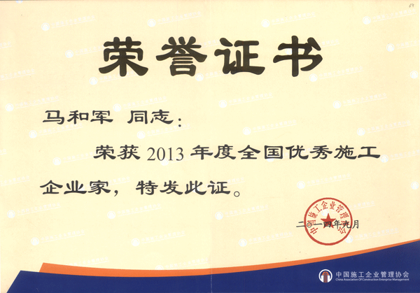 中國施工企業(yè)管理協(xié)會于今年2月發(fā)出召開“2014年全國施工企業(yè)領(lǐng)軍人物峰會”的通知,根據(jù)通知要求,嚴格按照“全國優(yōu)秀施工企業(yè)家”條件在全國范圍內(nèi)優(yōu)選參會代表。經(jīng)申請、推薦、審核、公示,中國施工企業(yè)管理協(xié)會企業(yè)家工作委員會審定,確定166位企業(yè)領(lǐng)導(dǎo)為“2014年全國施工企業(yè)領(lǐng)軍人物峰會”參會人選并授予“全國優(yōu)秀施工企業(yè)家”榮譽稱號。公司董事長馬和軍榮列榜單之中。