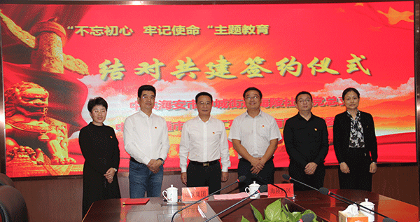 集團(tuán)黨委根據(jù)“不忘初心  牢記使命”主題教育的部署,10月12日在集團(tuán)總部與海安市中城街道海陵社區(qū)黨總支完成結(jié)對共建簽約儀式。中城街道新陵辦事處黨委書記周海冰、政工書記唐濤、海陵社區(qū)黨總支書記劉海燕、集團(tuán)黨委書記劉厚純、黨委宣傳委員杭小建等出席簽約儀式。