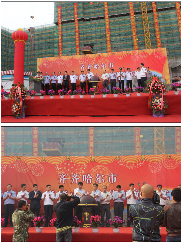 7時58分儀式正式開始。首先由第七工程公司經(jīng)理王建國同志代表公司董事長馬和軍同志作了熱情洋溢的致辭,齊齊哈爾市副市長、市公安局長吳剛宣布封頂儀式正式開始,并和王建國同志共同啟動慶典水晶球,項目建設各方共同慶賀這一激動的人心時刻。