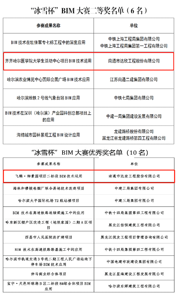 黑龍江省第一屆“冰雪杯”建設工程BIM大賽共收到30項成果,其內容涵蓋BIM應用的各個階段,通過初賽《飛鶴·御景園項目二標段工程BIM技術應用》榮獲“冰雪杯”BIM大賽優(yōu)秀獎,《齊齊哈爾醫(yī)學院大學生活動中心BIM技術應用》進入決賽并通過視頻直播答辯榮獲大賽二等獎。