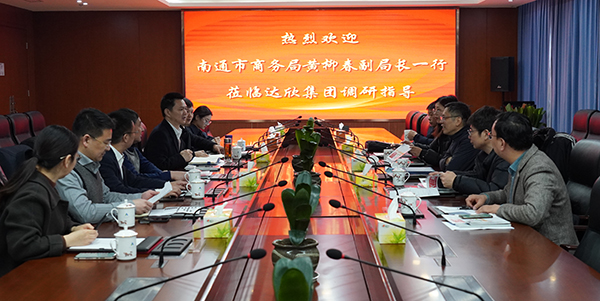 2月24日上午,南通市商務(wù)局黨組成員、副局長黃柳春率隊蒞臨達(dá)欣集團調(diào)研,海安市商務(wù)局副書記、副局長史霞兵,集團董事長馬和軍、黨委書記劉厚純、常務(wù)副總經(jīng)理王邦國等陪同。