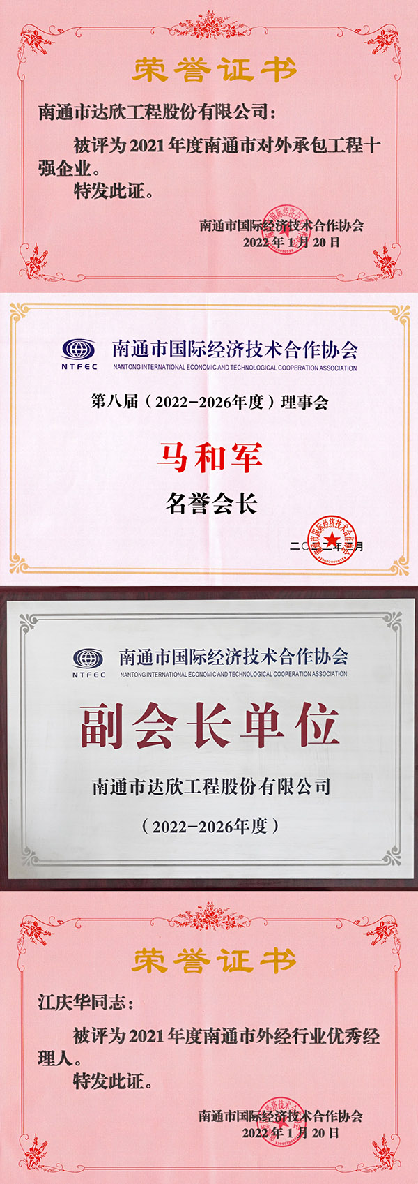 達(dá)欣集團(tuán)榮獲南通市對(duì)外承包工程十強(qiáng)企業(yè)、馬和軍當(dāng)選理事會(huì)名譽(yù)會(huì)長(zhǎng)