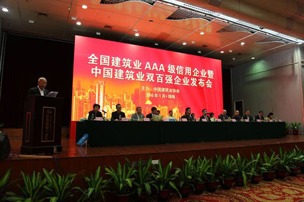 2016年1月7日,為展示全國建筑業(yè)AAA級信用企業(yè)和中國建筑業(yè)雙百強企業(yè)品牌形象,弘揚誠信經(jīng)營、追求卓越的行業(yè)風氣,中國建筑業(yè)協(xié)會在珠海召開2015年度全國建筑業(yè)AAA級信用企業(yè)暨2014年度中國建筑業(yè)雙百強企業(yè)發(fā)布會。中國建筑業(yè)協(xié)會會長王鐵宏、副會長兼秘書長吳濤出席會議,副秘書長李蓬主持會議。廣東省住房城鄉(xiāng)建設(shè)廳黨組副書記、巡視員陳英松致歡迎辭,各地區(qū)和有關(guān)行業(yè)建設(shè)協(xié)會和企業(yè)代表等共400余人參會。